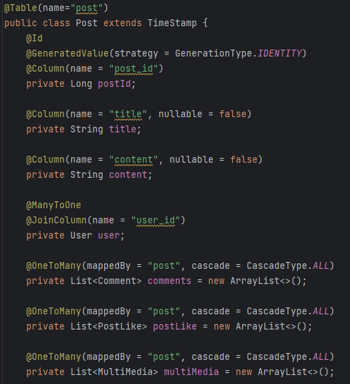 게시글은 사용자와 N:1 관계를 댓글, 좋아요, 멀티미디어와는 1:N 관계를 맺고 있다.