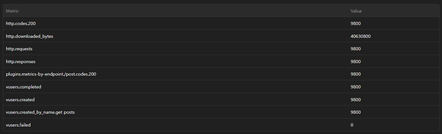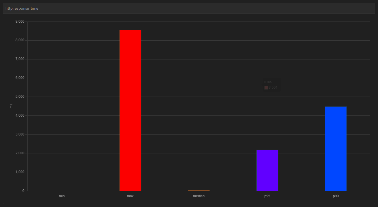 하지만 단순히 얼마나 많이 요청에 응답을 했느냐만 보면 안 된다. 이건 컴퓨터 사양이나 현재 실행 중인 프로그램이 얼마냐 되느냐에 따라 달라질 수 있는 거라 결과 아래쪽에 보이는 http.response_time에서 median - p95 - p99 간의 차이를 유의미하게 보아야 한다.