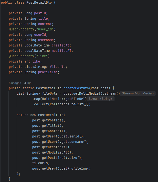 게시글 목록 조회할 때 별도의 쿼리문을 각각 작성해야 하나 고민하다가 ResponseDto에 바로 연관관계 필드를 이용해서 리턴값에다가 넣어주고는 쿼리문 따로 작성 안 해도 되는구나 하고 좋아했다.